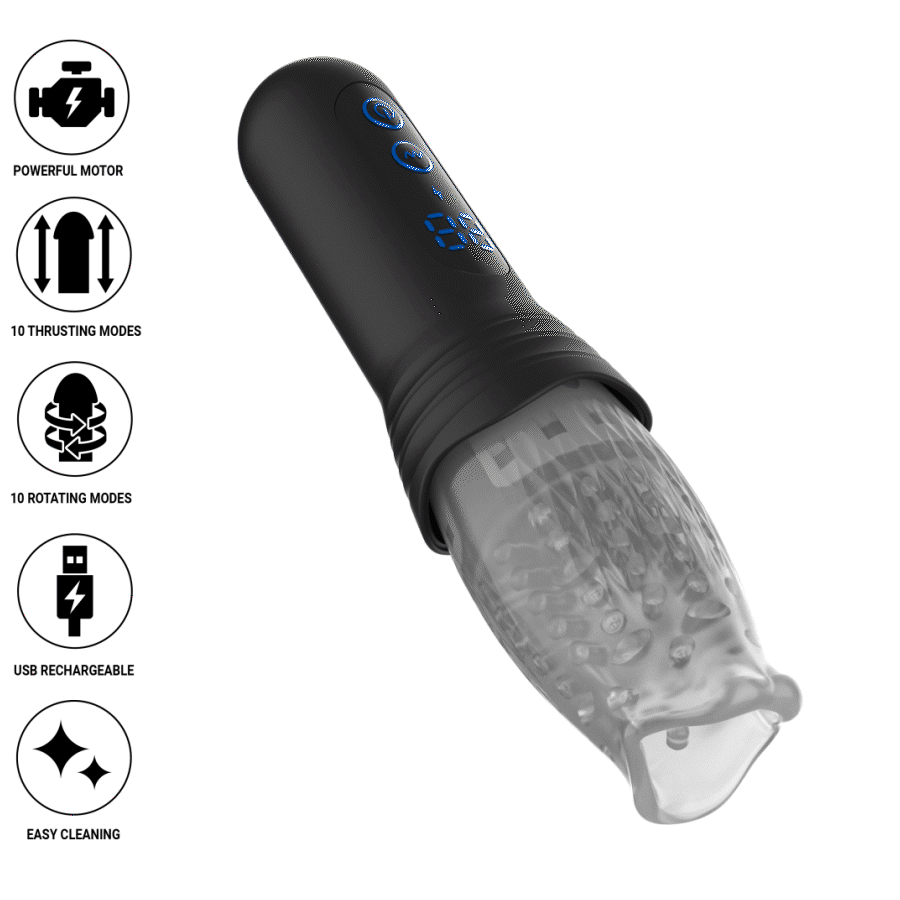 Alimentato da 2 potenti motori , è dotato di 9 funzioni di spinta e rotazione a 360° che funzionano in modo fluido e dinamico. Questo sistema crea movimenti multidirezionali (sinistra, destra, su e giù) per una stimolazione profonda e varia. Inoltre, include 9 funzioni di vibrazione che possono essere utilizzate indipendentemente o combinate per adattarsi a ogni momento.