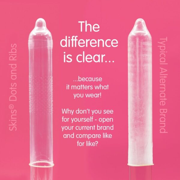 Skins ha combinato nervature rialzate strategicamente posizionate per offrire un piacere maggiore a chi le indossa con puntini deliziosamente delicati per offrire sensazioni più intense al partner, lavorando in armonia per massimizzare il piacere e il godimento di entrambi i partner durante i momenti di intimità. I preservativi Skins Dots & Ribs sono realizzati in lattice naturale di alta qualità per una sensazione migliorata, resistente e trasparente. Così sottili che sembrano una seconda pelle! Non entrare mai senza Skin! Se usati correttamente, i preservativi Skins Dots & Ribs riducono notevolmente il rischio di gravidanza e di infezioni sessualmente trasmissibili, sebbene nessun metodo contraccettivo possa fornire una protezione al 100%.