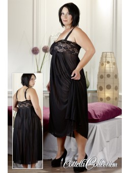 Sex appeal classico! Vestaglia in delicato materiale trasparente nero, e perizoma corrispondente incluso. Vestaglia lunga, svasata con coppe in pizzo. Cinghie regolabili. Materiale: 92% Poliammide, 8% elastan.